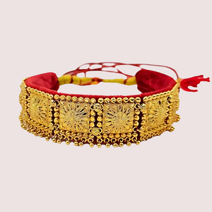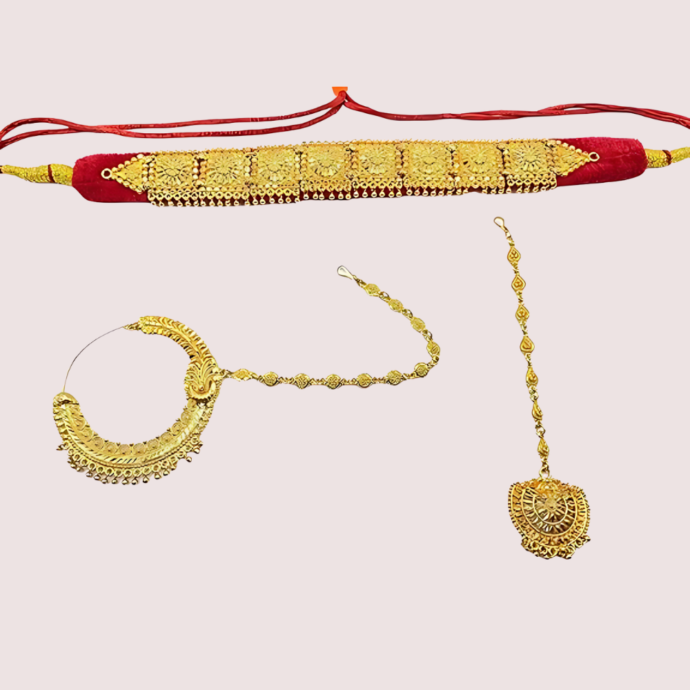 The Kumauni Guloband with Nath & Mangtika set is a stunning traditional jewelry trio. It includes a Guloband (choker necklace), a Nath (nose ring), and a Mangtika (forehead ornament). Each piece is designed with the rich cultural style of Kumaon, making it perfect for special events like weddings or festivals. The set combines elegant craftsmanship with traditional beauty, adding a touch of charm and grace to your look. Whether you’re dressing up for a celebration or embracing cultural heritage, this set is a beautiful choice.